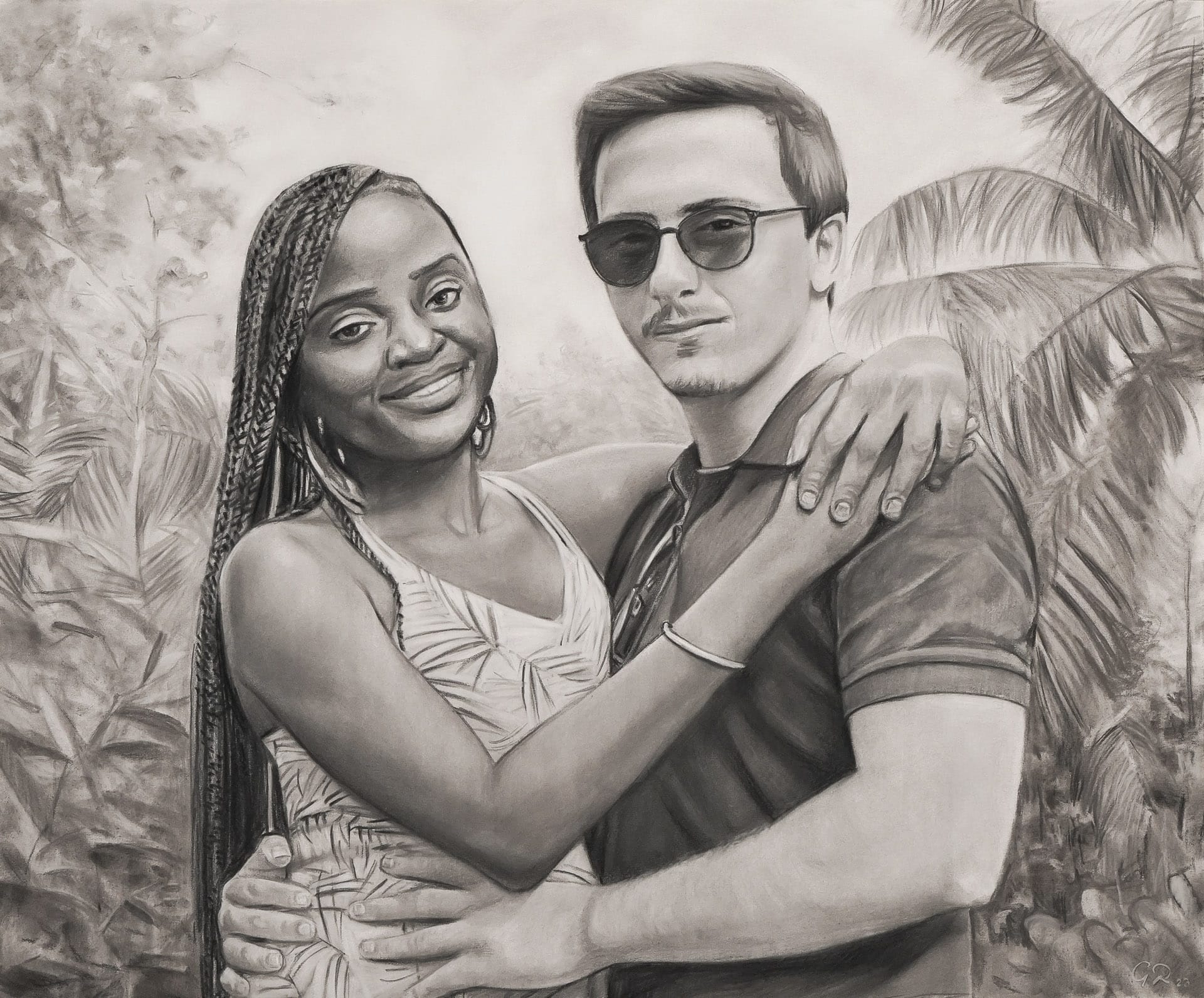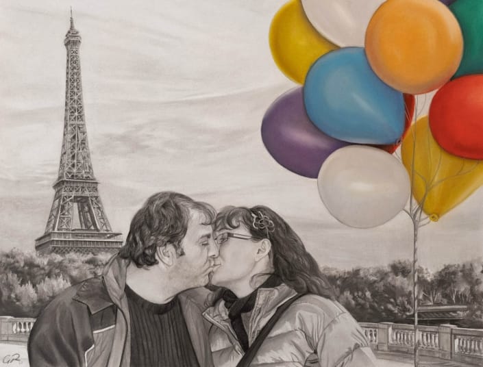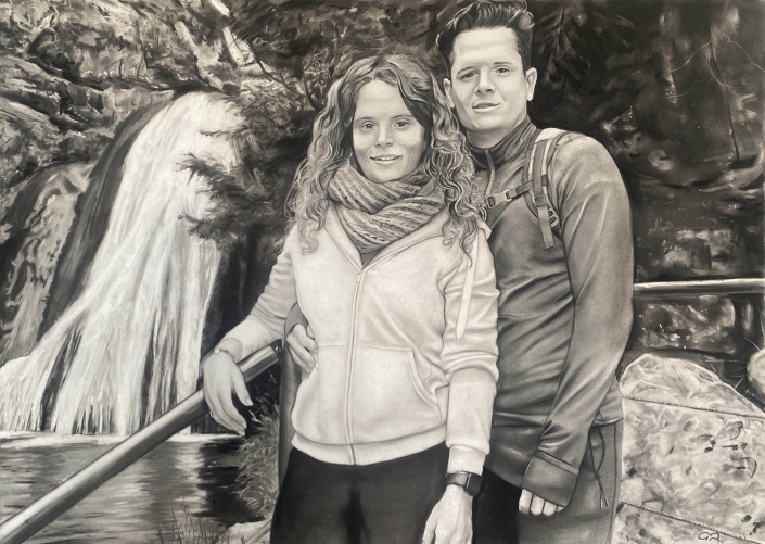 Los retratos al carboncillo de parejas son una de nuestras especialidades. Capturamos la esencia de la relación y el amor que existe entre las dos personas retratadas, utilizando nuestra técnica realista y detallada que respeta el parecido de manera fiel y precisa. En nuestros retratos, buscamos reflejar la conexión y la complicidad que existe entre los miembros de la pareja, capturando detalles y expresiones que hacen que el retrato sea único y especial.
